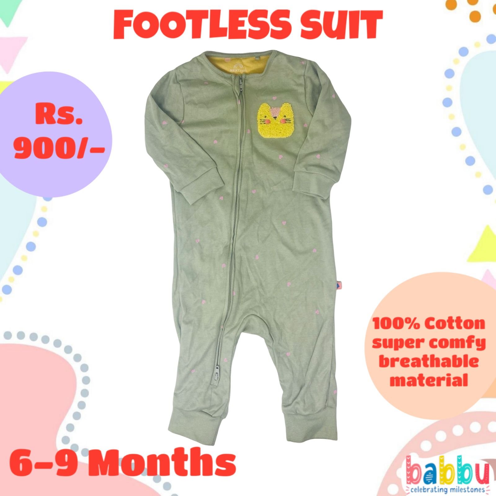 Footless suits 6-9 Months -Green with Yellow Cat Face