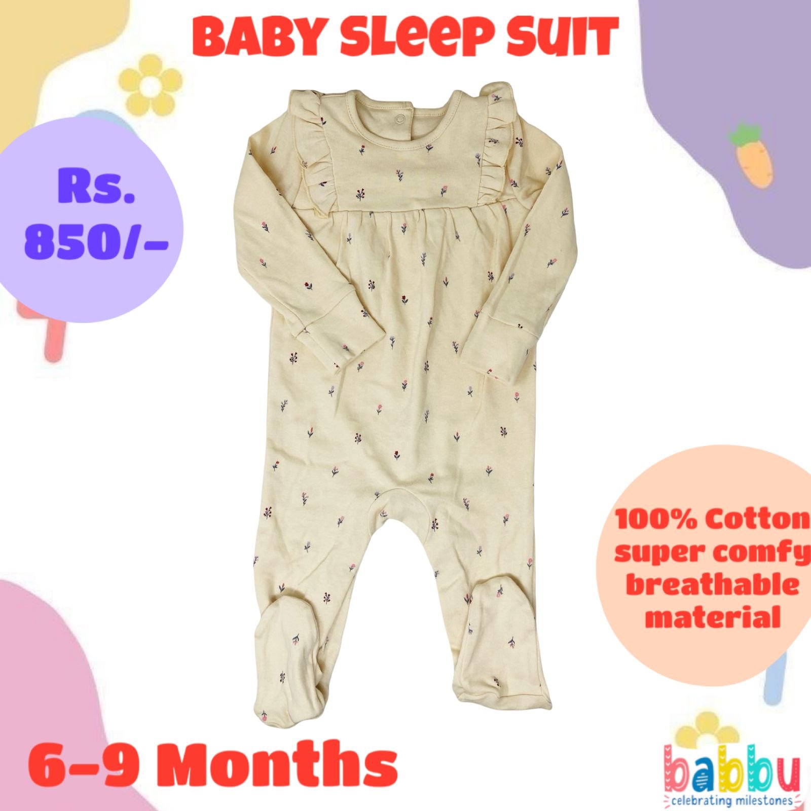Sleep Suits 6-9 Months – Beige with Small Red Flowers Back Buttons