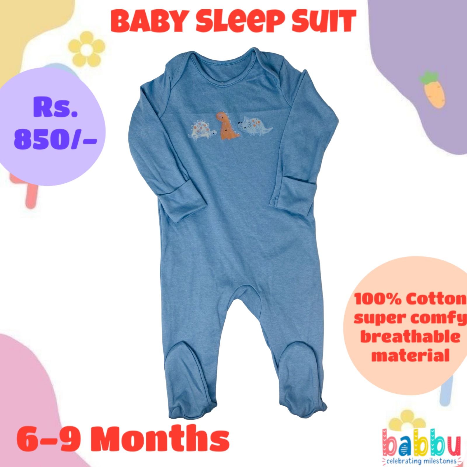 Sleep Suits 6-9 Months – Blue Three Dinos