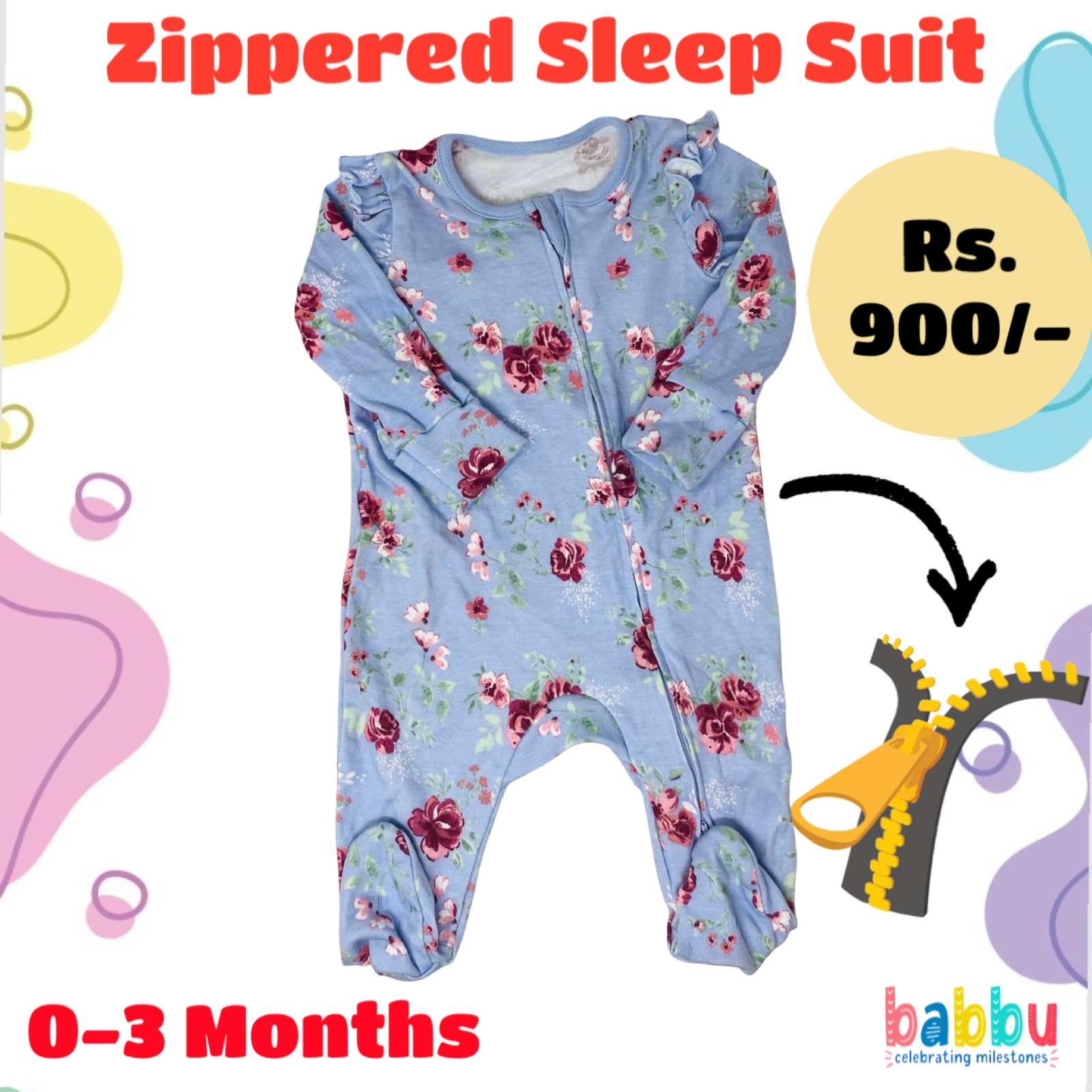 Zipper Sleep suits 0-3 Months – Blue with Roses