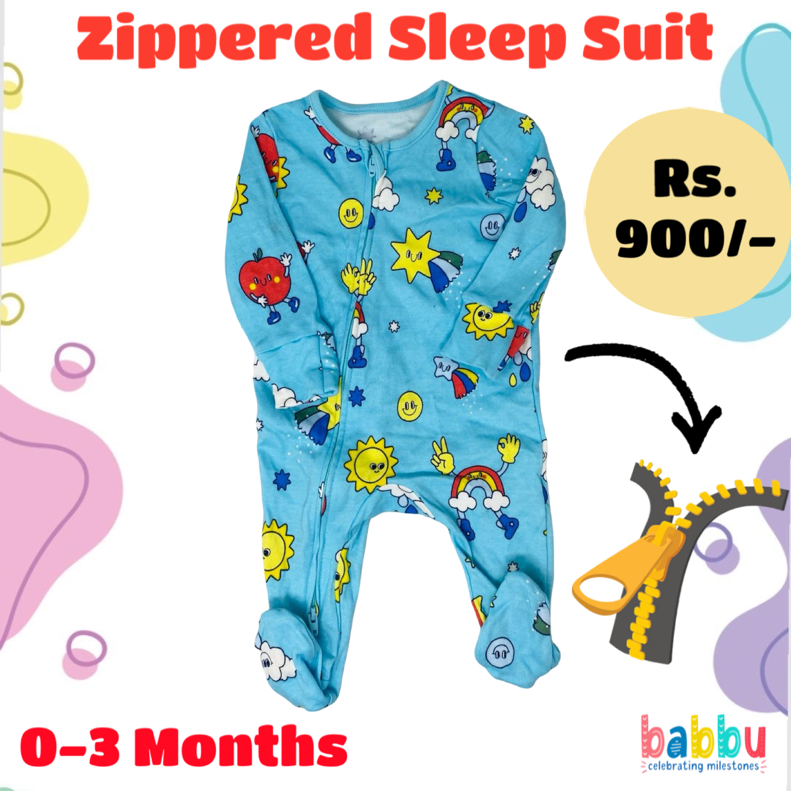 Zipper Sleep suits 0-3 Months -Blue with Shapes