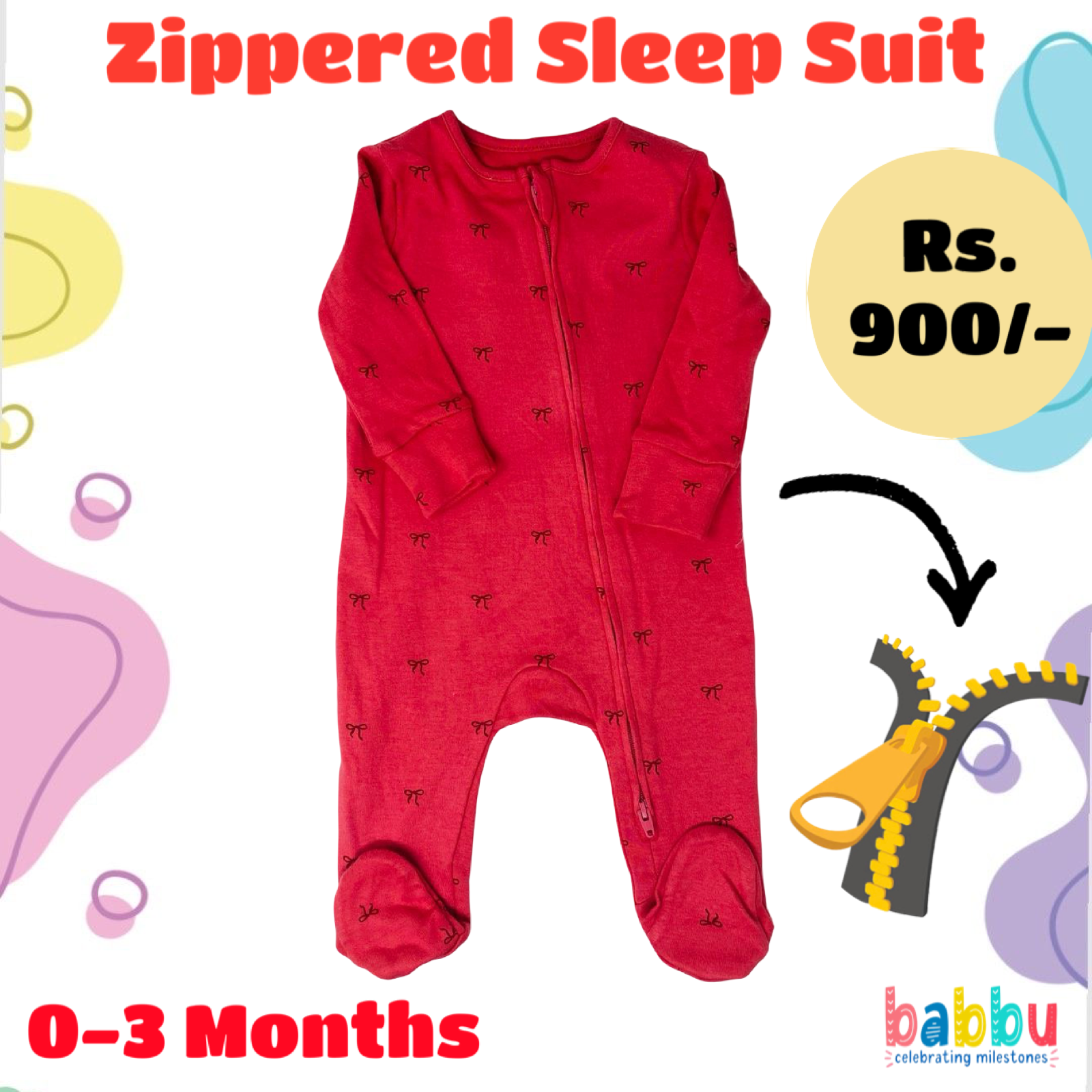 Zipper Sleep suits 0-3 Months -Red with Small Bows
