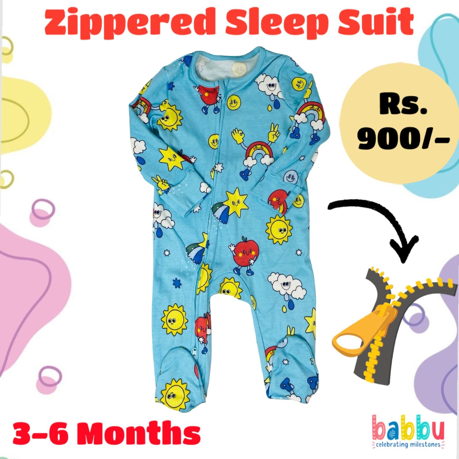 Zipper Sleep suits 3-6 Months – Light Blue with Shapes