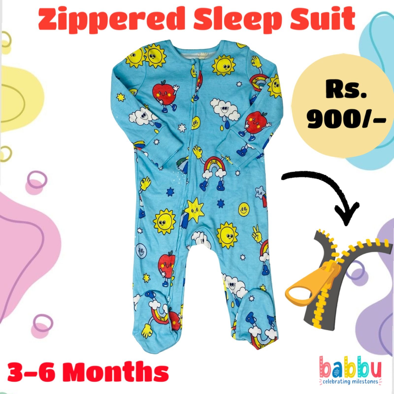 Zipper Sleep suits 3-6 Months – Light Blue with Sun and Objects