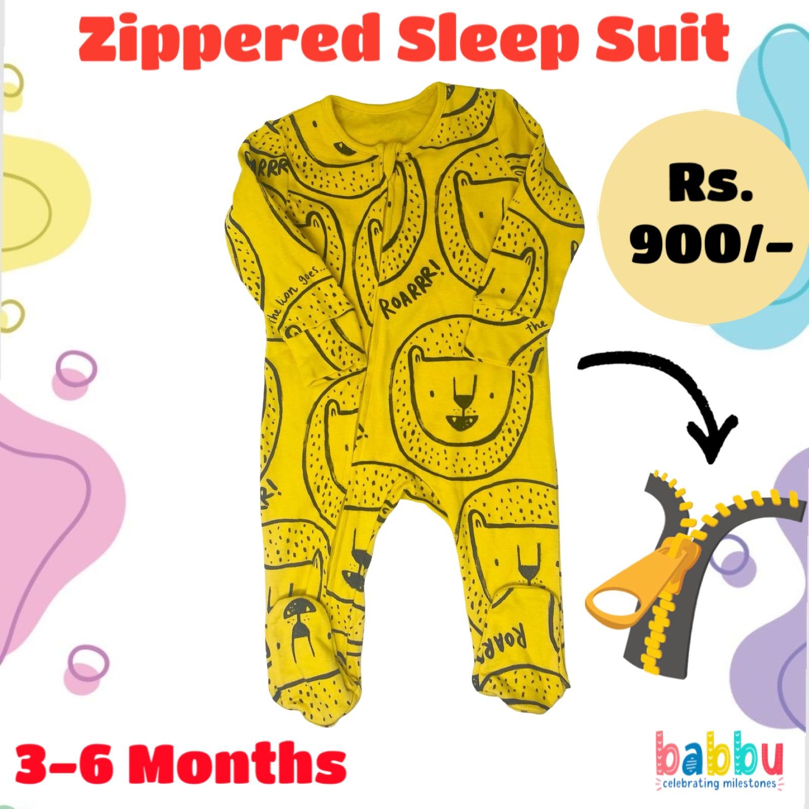 Zipper Sleep suits 3-6 Months – Yellow with Lion Faces