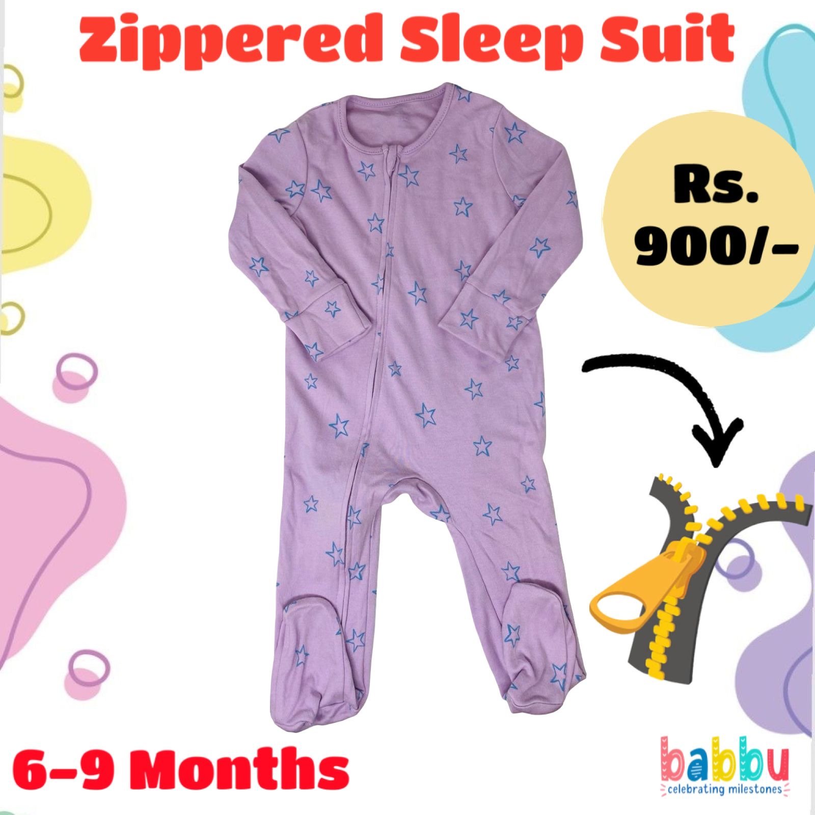 Zipper Sleep suits 6-9 Months – Purple with Blue Stars