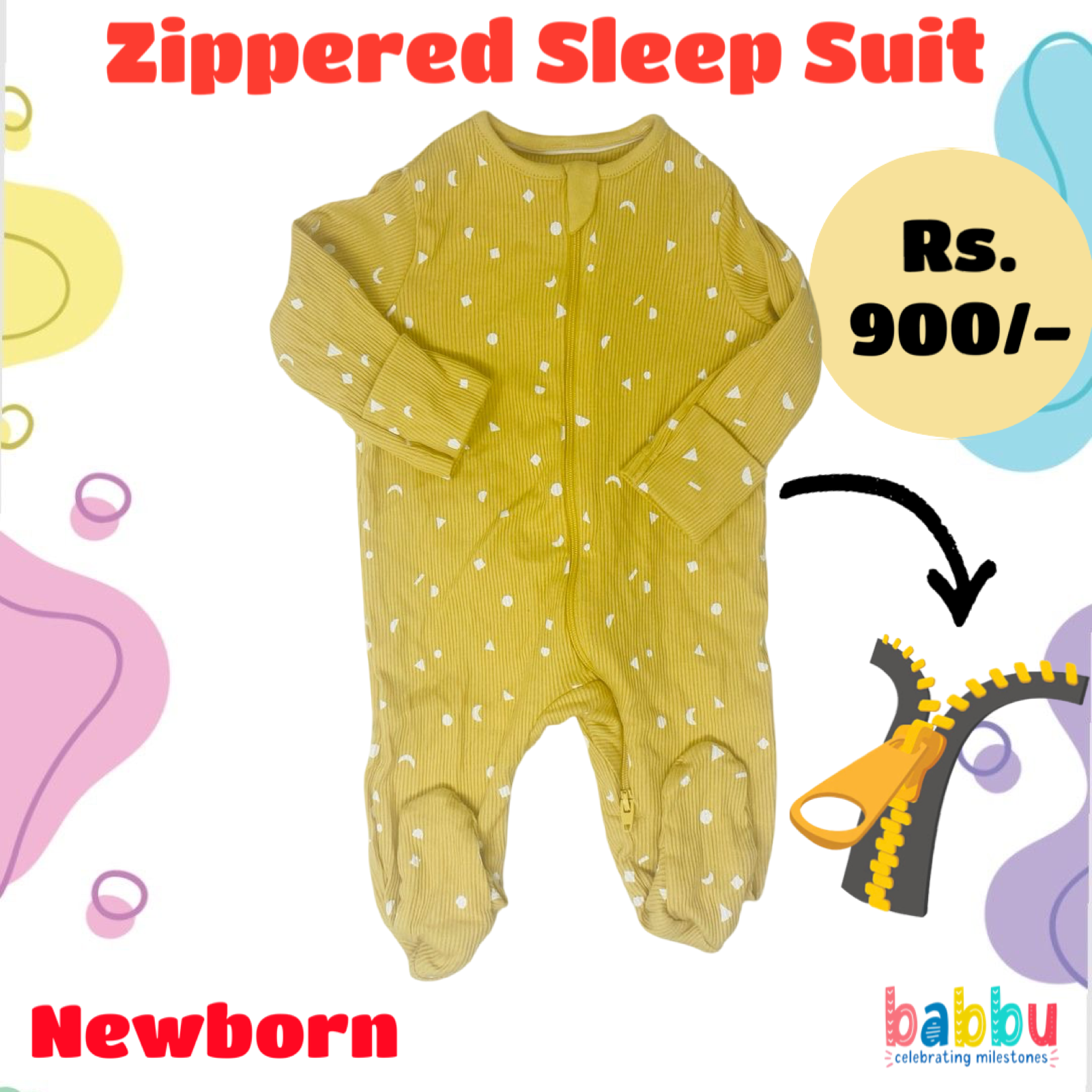 Zipper Sleep suits Newborn – Yellow with White Shapes